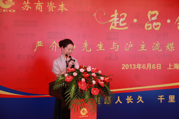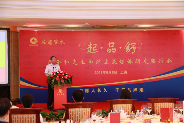 6月6日,“起·品·舒——严介和先生与沪主流媒体朋友联谊会”在黄浦江畔东方滨江酒店举行,中央电视台、《人民日报》、《新民晚报》等30家主流媒体齐聚一堂,此次联谊会是苏商资本在开业典礼后对媒体的首次亮相,旨在通过与媒体朋友自由交流,让各主流媒体切实走近严介和先生,真诚互动。
